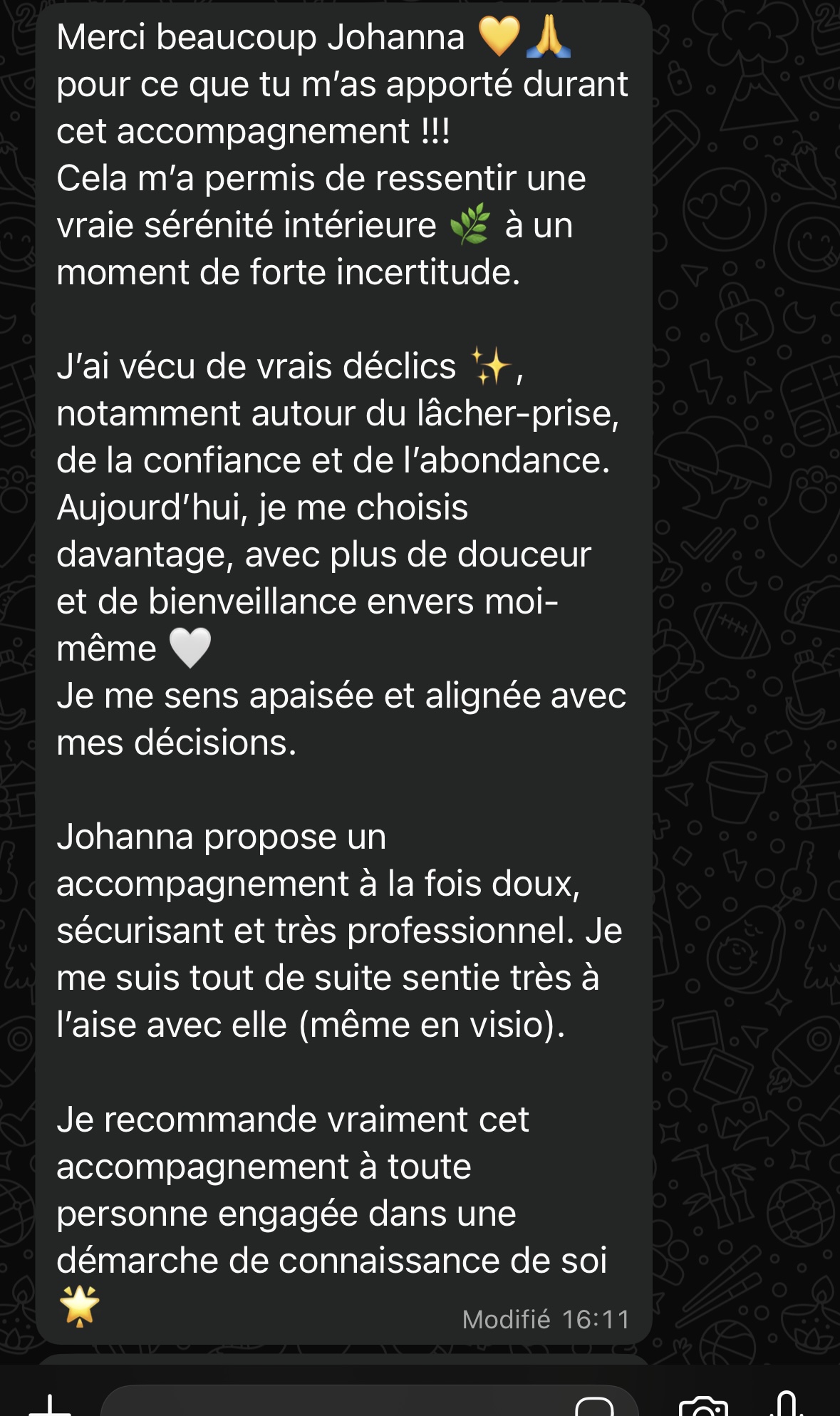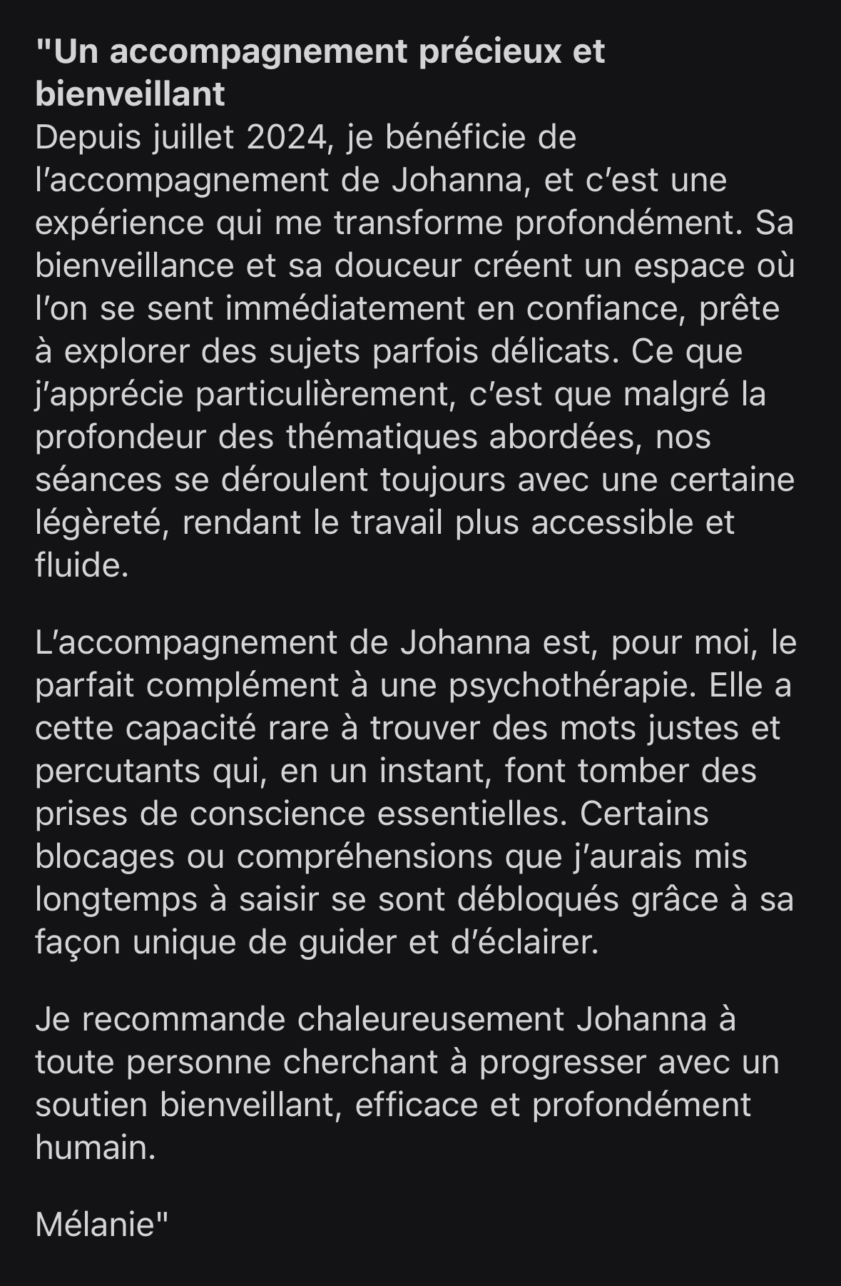 Je recommande vivement Johanna à toute personne en quête de sens, de solutions, ou d’un accompagnement bienveillant et structurant dans une phase de transition.